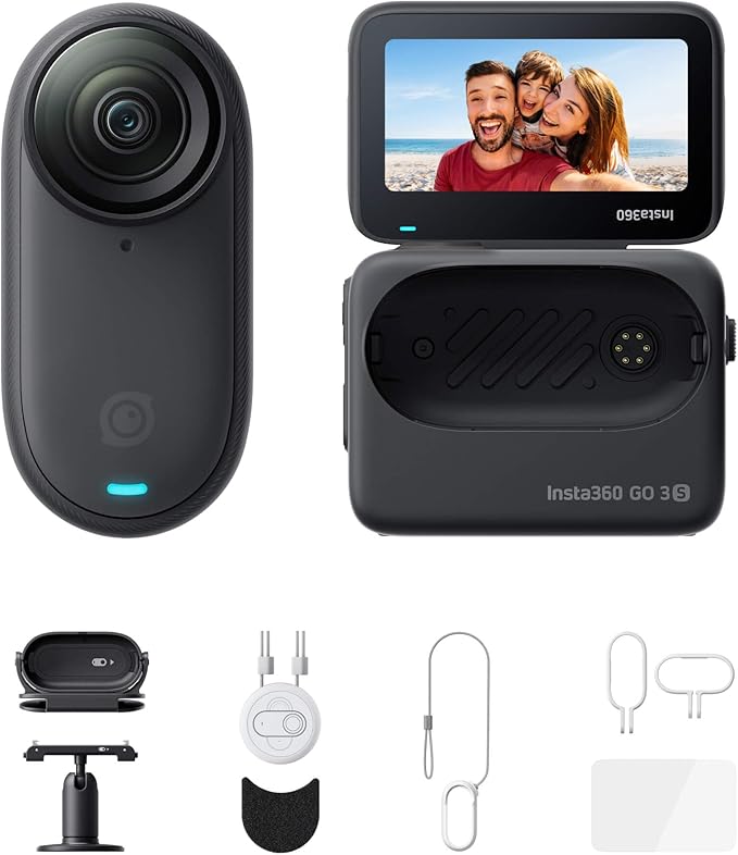 Insta360 GO 3S Kit de Acción – Cámara Vlogging 4K, POV Manos Libres, Móntala Donde Quieras, Estabilización, 140 Min de batería, Impermeable 10 M, Edición IA, Apple Find My, Vlog, Viajes, Negro